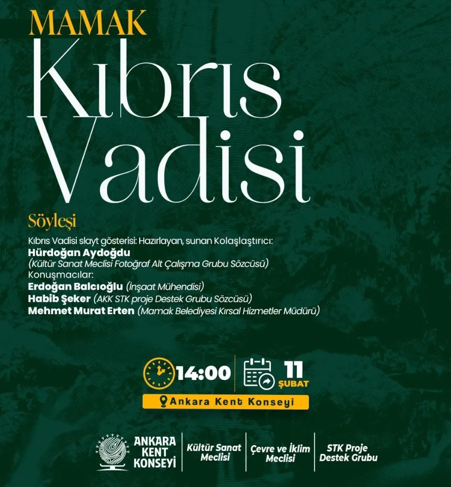 Söyleşinin konuşmacıları arasında; İnşaat Mühendisi Erdoğan Bacıoğlu, AKK STK Proje Destek Grubu Sözcüsü Habib Şeker ve Mamak Belediyesi Kırsal Hizmetler Müdürü Mehmet Murat Erten yer alacak. Alanında uzman isimler, Kıbrıs Vadisi’ne ilişkin teknik, çevresel ve yerel yönetim perspektiflerini paylaşacak.