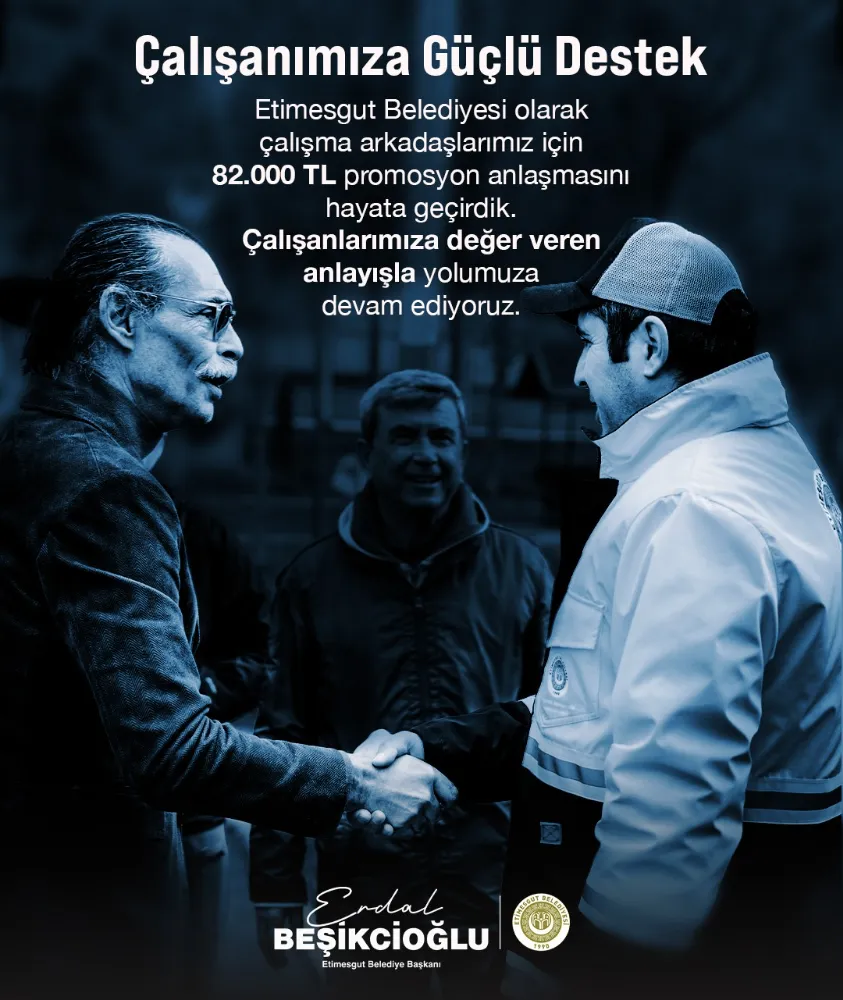 “Etimesgut Belediyesi olarak çalışma arkadaşlarımızın emeğini çok kıymetli buluyoruz. Belediyemizin gücü, sahada ve masa başında özveriyle çalışan personelimizin alın terinden geliyor. Bu nedenle çalışanlarımızın sosyal ve ekonomik koşullarını iyileştirmeyi önemsiyoruz. 82.000 TL promosyon anlaşmasını da bu anlayışla hayata geçirdik. Çalışanımıza değer veren, onları güçlü destekleyen bir yönetim anlayışıyla yolumuza devam edeceğiz.”