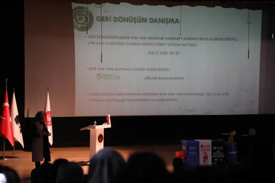 Necip Fazıl Kısakürek Tiyatro Salonu’nda gerçekleştirilen programda, Keçiören Belediyesi’nde görev yapan Çevre Mühendisi Vildan Gültekin tarafından detaylı bir sunum yapıldı. Seminerde; çevre ve çevre kirliliği, atık türleri, düzensiz depolamanın yol açtığı zararlar, bertaraf yöntemleri, sıfır atık sistemlerinin işleyişi, atık hiyerarşisi, geri dönüştürülebilir atık grupları ile geri dönüşümün ekolojik ve ekonomik katkıları gibi birçok başlık ele alındı.