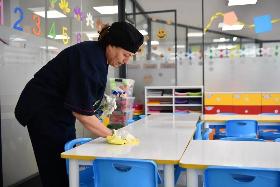 Çocukların sağlığı ve güvenliğini esas alan ekipler, sınıflardan oyun alanlarına, mutfaklardan ortak kullanım bölümlerine kadar tüm alanlarda titiz bir temizlik yürütüyor.
