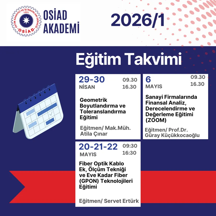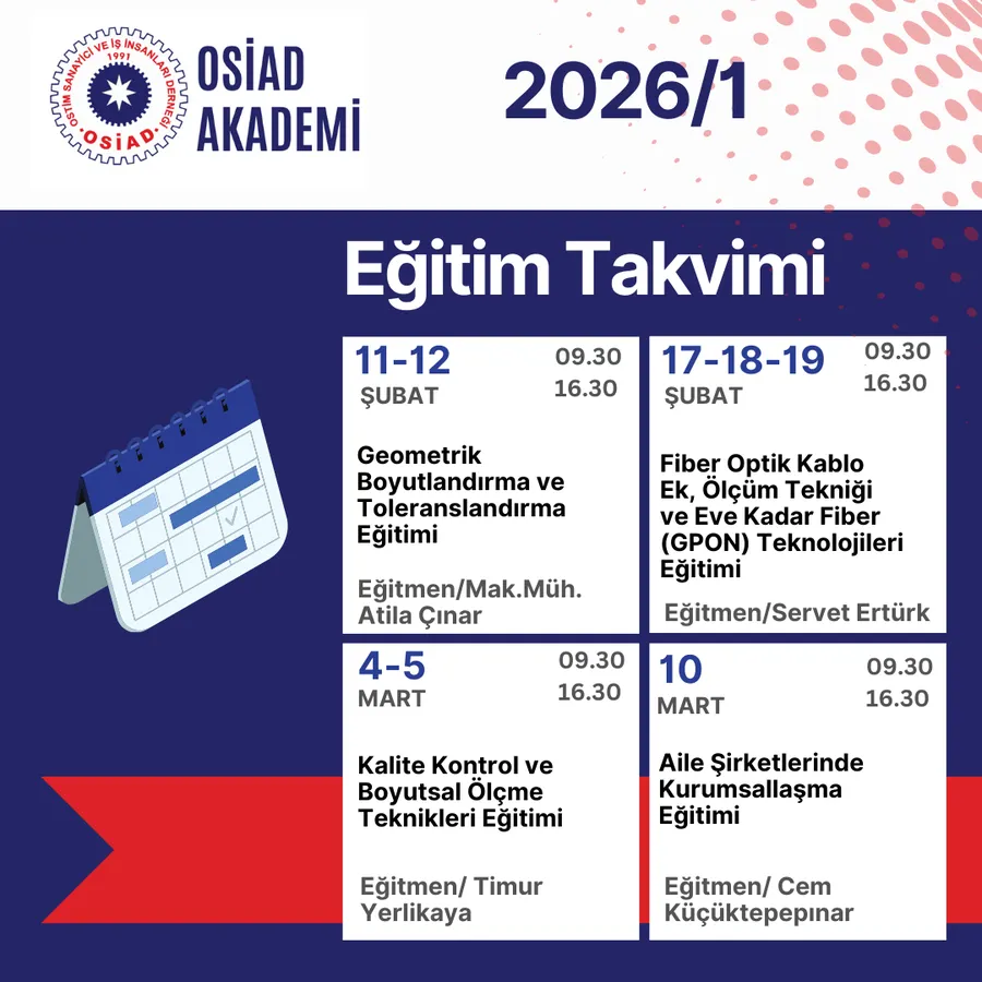 OSİAD Akademi tarafından yapılan açıklamada, 21 Ocak tarihinde başlayacak olan 2026 yılı 1. Dönem eğitimleri 21 Ocak tarihinde başlayacak. 21 Mayısta bitecek. Sabah 09.30 akşam 16.30 saatleri arasında; sanayi, ticaret, yönetim, dijital dönüşüm, insan kaynakları, aile şirketlerinde kurumsallaşma gibi başlıklarda planlandığı belirtildi. Program kapsamında hem teorik bilgi hem de uygulamaya dönük eğitimlerin yer alacağı ifade edildi.