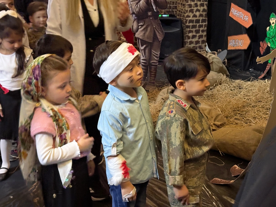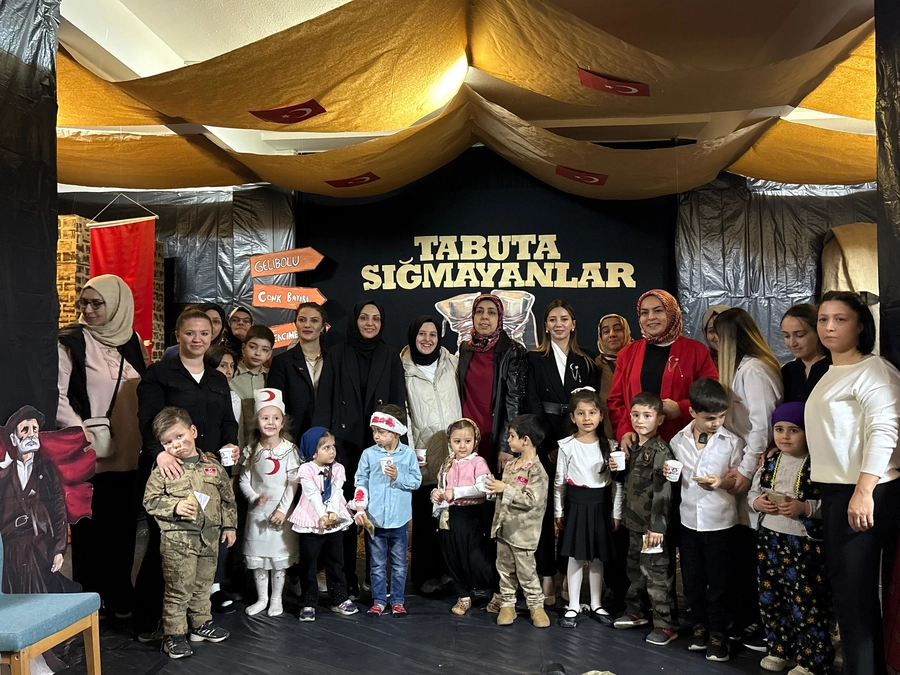 Program kapsamında minikler, cephede çatışan askerleri ve onlara yardım eden sağlık çalışanlarını canlandırdı. Gitar ve bağlama eşliğinde Çanakkale türkülerinin de seslendirildiği gösteri, izleyenlere duygu dolu anlar yaşattı. Yenikent Anne Çocuk Oyun Evi minikleri performanslarıyla büyük alkış topladı.