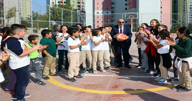 Sınıfları gezen ve çocuklarla birlikte bahçede basketbol oynayan Başkan Altınok´a Şehit Hüseyin Köksal Ortaokulu Müdürü Mehmet Özer plaket takdim etti.
