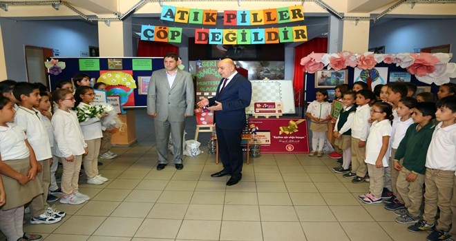 Çocuklarla sohbet ederek çevre duyarlılıklarından ötürü tebrik eden ve onlarla birlikte atık pilleri geri dönüşüm kutusuna atan Altınok, satranç eğitim seti ve sinema bileti hediye etti.