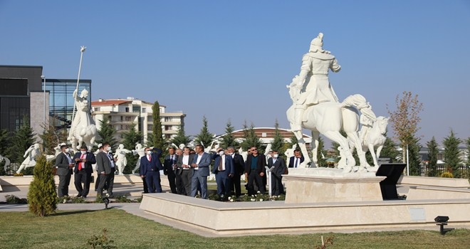 Müzedeki, heykel, rölyef ve komposiyonlar önünde bol bol hatıra fotoğrafı çektiren muhtarlar,