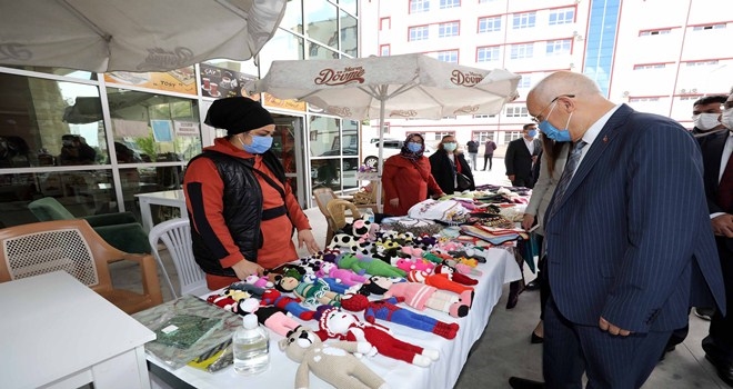 Yaşar, Yenimahalle Belediyesi Başkan Vekili Mehmet Kartal ile birlikte stantları tek tek gezerek, Yenimahalleli kadınların el emeği göz nuru ürünlerini inceledi.
