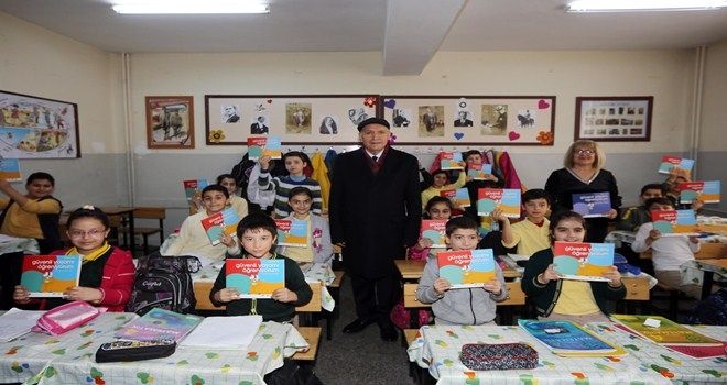 4´üncü sınıf ve üzeri için hazırlanan kitabı ilk sınıfa kendi elleriyle dağıtan Yaşar, çocuklara kitabı dikkatlice okumalarını tavsiye etti.