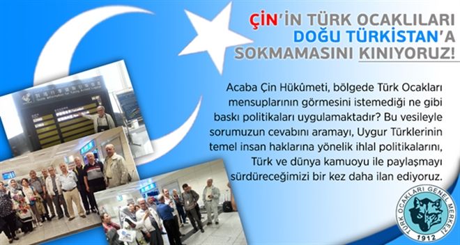 Türkiye´nin en köklü sivil toplum kuruluşu olarak, Türk vatandaşlarına maruz görülen bu muameleyi şiddetle kınıyoruz. Ayrıca Urumçi Havaalanı´nda yaşananlar, Doğu Türkistan´daki soydaşlarımızın maruz kaldıkları insan hakları ihlalleriyle ilgili kaygılarımızı daha da arttırmıştır. Acaba Çin Hükûmeti, bölgede Türk Ocakları mensuplarının görmesini istemediği ne gibi baskı politikaları uygulamaktadır? Bu vesileyle sorumuzun cevabını aramayı, Uygur Türklerinin temel insan haklarına yönelik ihlal politikalarını, Türk ve dünya kamuoyu ile paylaşmayı sürdüreceğimizi bir kez daha ilan ediyoruz.