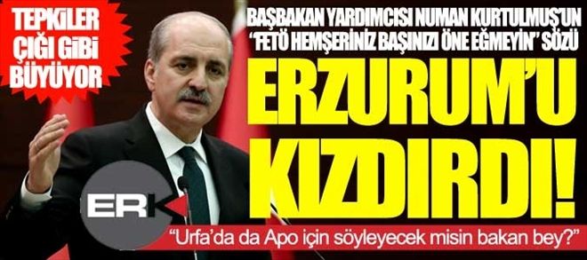 Başbakan Yardımcısı Numan Kurtulmuş, "FETÖ maalesef Erzurum´un hemşerisi, Erzurumlular sakın ha yüzünüz yere eğilmesin. Onun hemşeriniz olmasından dolayı en ufak utanç duymayın" sözleriyle Erzurum´da büyük tepki çekti. Kurtulmuş´un sözlerine sosyal medya üzerinden tepki gösteren Erzurumlular, "Biz başımızı öne mi eğdik ki, Numan Bey böyle bir ifadeyi kullanma ihtiyacı hissetti? Erzurum bu hain örgüte tepkisini hem 17/25 Aralık´ta hem de 15 Temmuz gecesi göstermiştir" dediler.