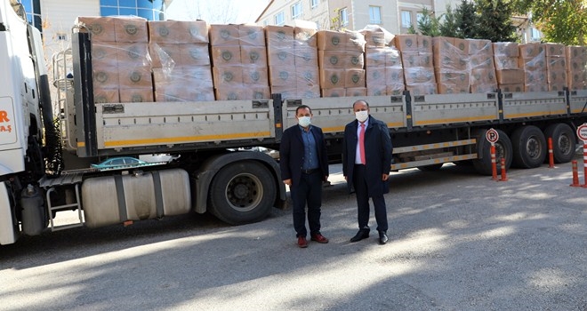 Etimesgut Kaymakamı İzzettin Sevgili ve Etimesgut Belediye Başkanı Enver Demirel Etimesgut Belediyesi Şefkateli Çarşısı´ndan yüklenen gıda malzemelerini incelediler.