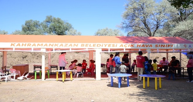 Belediye etkinlikler kapsamında ilçedeki tarım işçisi ailelerin çocuklarına verilen telafi etkinliklerinin daha konforlu ortamlarda yapılabilmesi için açık hava sınıfı ve platform oluşturdu. Edebiyat Öğretmeni olan Kahramankazan Belediye Başkanı Serhat Oğuz da ders arasında ziyaret ettiği öğrencilere dondurma ikram ederek, onlarla sohbet etti.