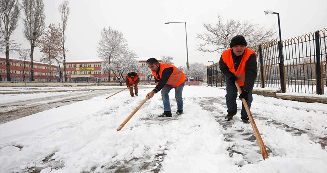 Yolları açık tutarak trafiğin aksamaması için büyük uğraş veren ekipler, Yenimahalle´nin tüm yaya kaldırımlarını, parklarını, okul, sağlık ocakları ve cami avlularını da olası kazalara karşı temizliyor.