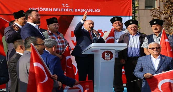 Atatürk´ün ?Söz konusu vatansa gerisi teferruattır? sözünü hatırlatarak, Keçiören´deki tüm partilerin ortak kararıyla Barış Pınarı Harekatını desteklediklerini vurgulayan Başkan Altınok, ?Gazi Mustafa Kemal Atatürk, ?Ya İstiklal ya ölüm´ diyerek manda ve himayeyi kabul etmiyor, bizler de bu ülkenin sonsuza kadar var olması için devletimizin, ordumuzun sonuna kadar yanındayız, bu vatan hepimizin, ayrım yapan kalleştir. Vatanı, milleti, devleti için 942 bin Keçiörenli sefer görev emrine hazır, ezanımız dinmesin, bayrağımız inmesin, Türkiye Cumhuriyeti devletimiz ilelebet payidar olsun? diye konuştu.