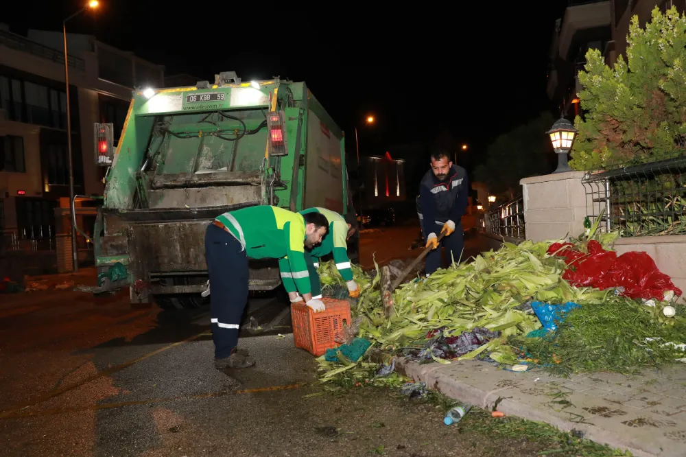 Pazarın sona ermesiyle birlikte sahaya inen ekipler, önce pazaryerinde biriken katı atıkları topluyor, ardından köpüklü suyla fırçalayarak zemini dezenfekte ediyor. Son aşamada ise sokak, tankerlerdeki tazyikli suyla yıkanarak hem kötü kokuların hem de olası sağlık risklerinin önüne geçiliyor. Yapılan bu çalışmalarla yalnızca çevresel temizlik değil, aynı zamanda gıda güvenliği ve halk sağlığı da güvence altına alınıyor.
