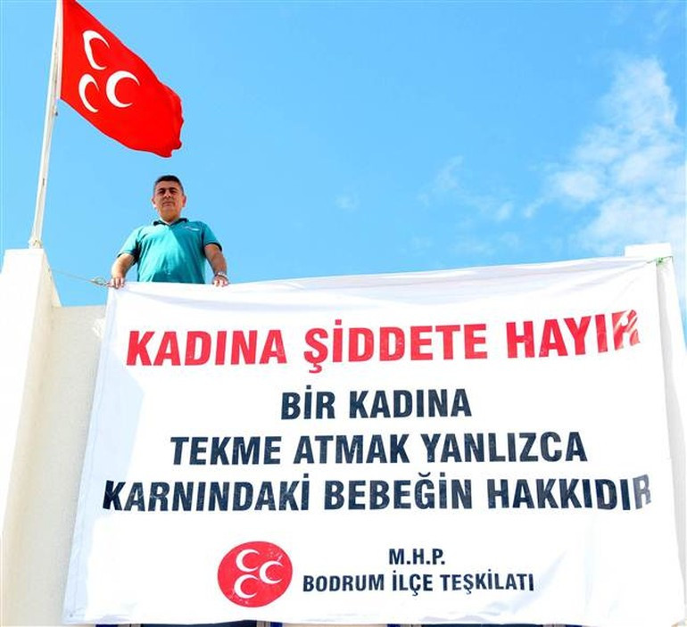 MHP Bodrum İlçe Başkanlığı, hemşire Ayşegül Terzi´nin şort giydiği için saldırıya uğramasına tepki gösterdi, binaya ´Kadına şiddete hayır, bir kadına tekme atmak sadece karnındaki bebeğin hakkıdır´ yazılı pankart astı.