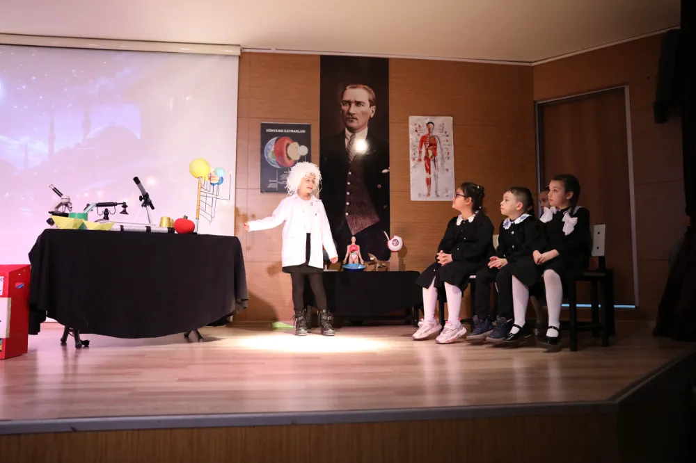 “Merak ettik, sorduk, denedik; bilimle öğrendik, geleceğe yürüdük” mesajıyla sahnelenen oyun, bilimin geçmişten günümüze insan hayatındaki yeri ve gelişimi, eğlenceli ve öğretici bir anlatımla izleyicilere aktarıldı. Sınıf ve laboratuvar sahneleri arasında ilerleyen oyunda, bilimsel bilgiyi keşfetmenin önemi vurgulandı.