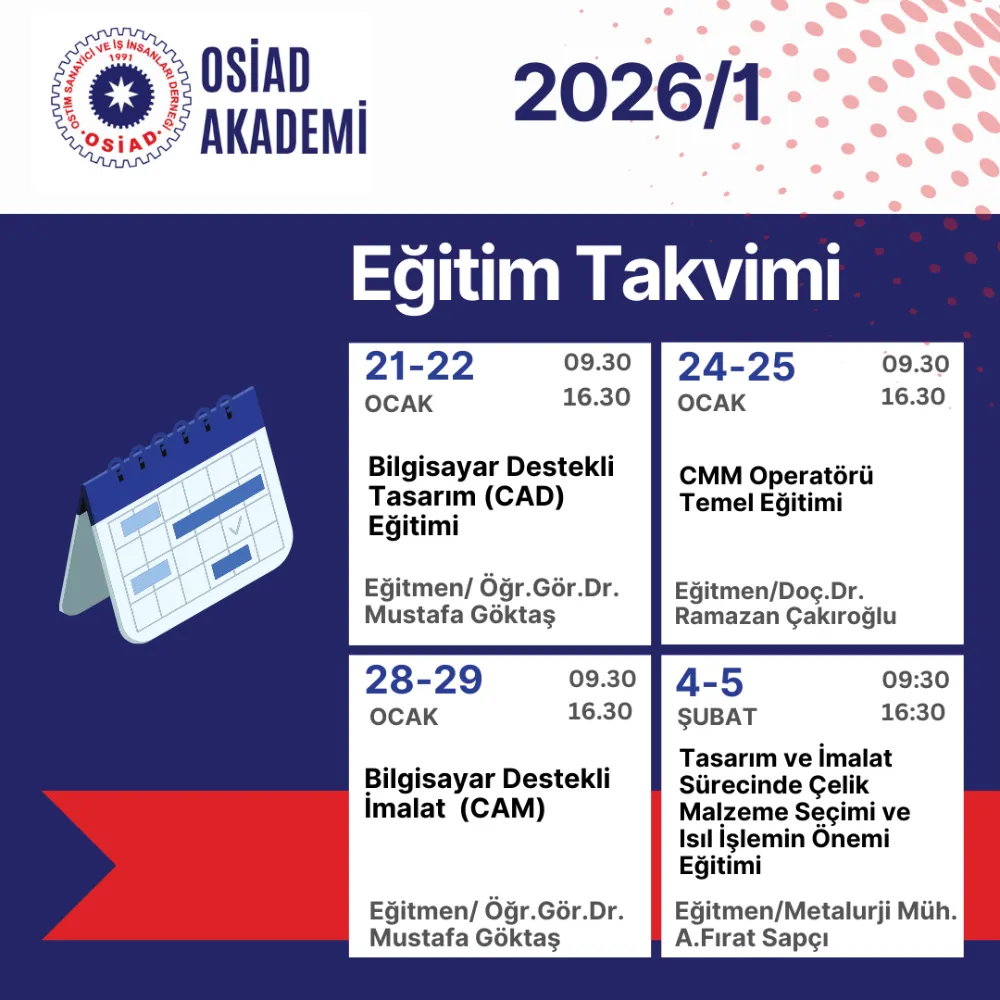 OSİAD Akademi tarafından yapılan açıklamada, 21 Ocak tarihinde başlayacak olan 2026 yılı 1. Dönem eğitimleri 21 Ocak tarihinde başlayacak. 21 Mayısta bitecek. Sabah 09.30 akşam 16.30 saatleri arasında; sanayi, ticaret, yönetim, dijital dönüşüm, insan kaynakları, aile şirketlerinde kurumsallaşma gibi başlıklarda planlandığı belirtildi. Program kapsamında hem teorik bilgi hem de uygulamaya dönük eğitimlerin yer alacağı ifade edildi.