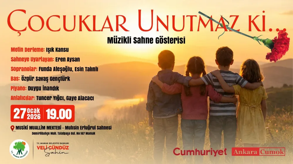 Mamak Belediyesi, Cumhuriyet gazetesi ve gazete okurlarının oluşturduğu gönüllülük hareketi “CUMOK” iş birliğiyle hazırlanan “Çocuklar Unutmaz ki” müzikli sahne gösterimi, 27 Ocak Salı günü saat 19.00’da Musiki Muallim Mektebi Muhsin Ertuğrul Sahnesi’nde izleyiciyle buluşacak.