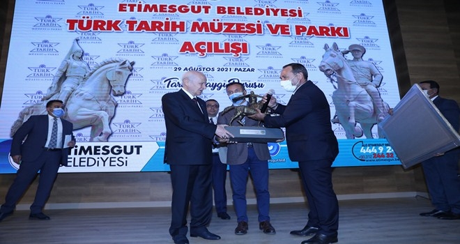 "Etimesgut Belediyesi hak ettiği başarıyı yakalamış, bu ilçemizde mukim vatandaşlarımızın takdir ve tebrikini fazlasıyla kazanmıştır" diyen Bahçeli şunları kaydetti: "Yapımı tamamlanıp sırayı açılışının aldığı ?Türk Tarih Müzesi ve Parkı? Etimesgut´a muazzam bir eser olarak kazandırılmış, geçmiş geleceğe halin müşahitliğiyle bağlanmıştır. Böylelikle başarı çıtası daha da yükselmiştir. Türk Tarih Müzesi ve Parkı´nın yapımında emeği geçen en başta Belediye Başkanımız Sayın Enver Demirel olmak üzere, sanatçısından mimarına, işçisinden müteahhidine, proje mühendisinden tasarım ustalarına kadar her kardeşime teşekkür ediyorum. Hepsini ayrı ayrı kutluyorum. Bu açık hava müzesini, gelecek nesillere emanet edilerek, onların tarih şuuruna erişmelerine destek olacak güzide bir yatırım, mümtaz bir eser olarak görüyorum. Üstelik çok da önemli telakki ediyorum. Burada Türk tarihinin bir özeti vardır. Burada hâkim olan geçmişin anı ve hatıraları, aynı zamanda istikbalin irade ve istikametine uzanan köprübaşlarıdır".