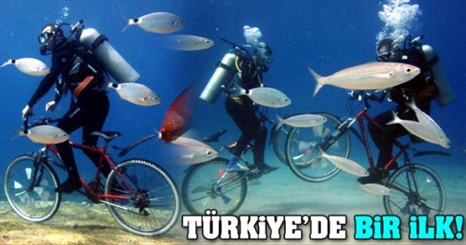 Muğla Fethiye´de 2 dalgıç, deniz dibinde bisiklete bindi. Vücutlarına bağladıkları ağırlıklarla bisikletleri sualtında tutmaya çalışan dalgıçlar 30 metreyi 10 dakikada gidelbildi.