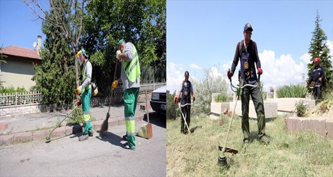 Ekipler yetki alanı içerisindeki mezarlıkları da temizliyor. Bayramda yapılacak kabristan ziyaretleri öncesi Karayakaya, Memlik, Yuva, İvedik, Yakacık ve Ergazi mezarlıklarını temizleyen ekipler, mezarlık çevresinde bulunan alanların temizlenmesi, yabani ot temizliği, çiçeklerin sulanması gibi çalışmalar yaparak mezarlıkları kuru otlardan ve çöplerden arındırıyor.