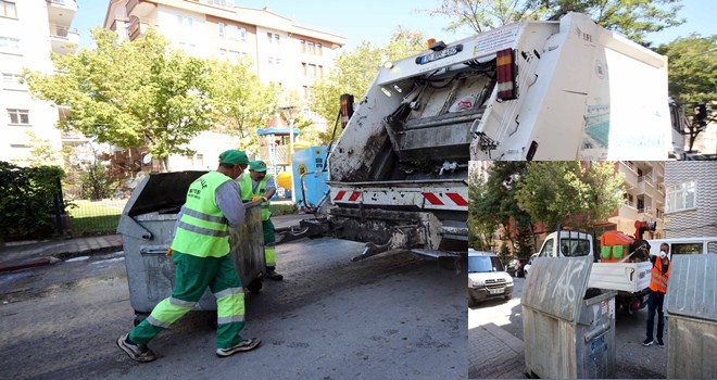 Öte yandanekipler, pazar yerleri, sokaklar, kaldırımlar ve çöp konteynerlerinin etrafını da deterjanlı su ile yıkayıp, ardından ilaçlama çalışması yapıyor.